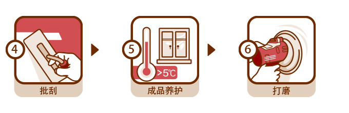 | 批刮找平: | 膩子每次批刮厚度應大于0.5 mm,不超過1.5mm,批刮總厚度不超過2mm,一次批刮過厚易出現干縮開裂。找平厚度大于2mm 應先用墻尼粉刷石膏進行抹灰找平。 膩子找平應在半干狀態下(用手輕壓不變形)完成,固化后用水砂紙打磨找平。 |